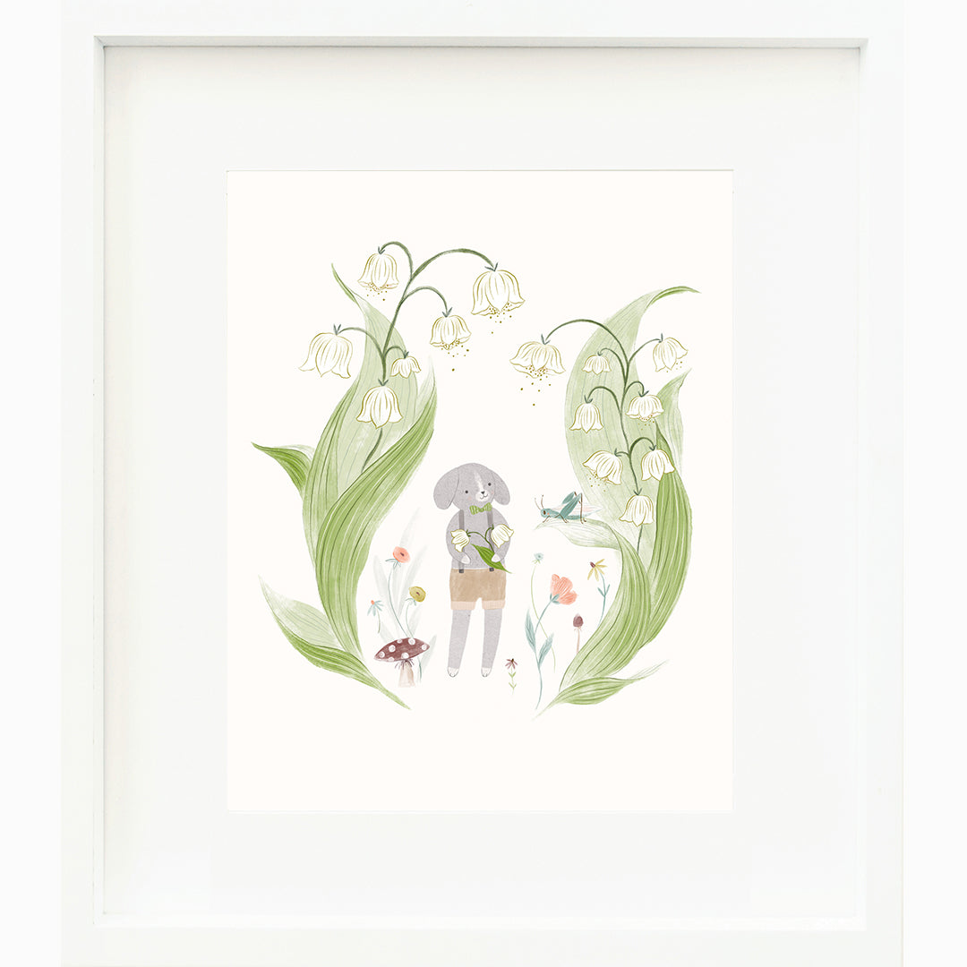 This stunning print features a breathtakingly hand painted watercolour rendition of Noah playing among lilies of the valley with his little grasshopper friend. A beautiful addition to any stylish nursery!